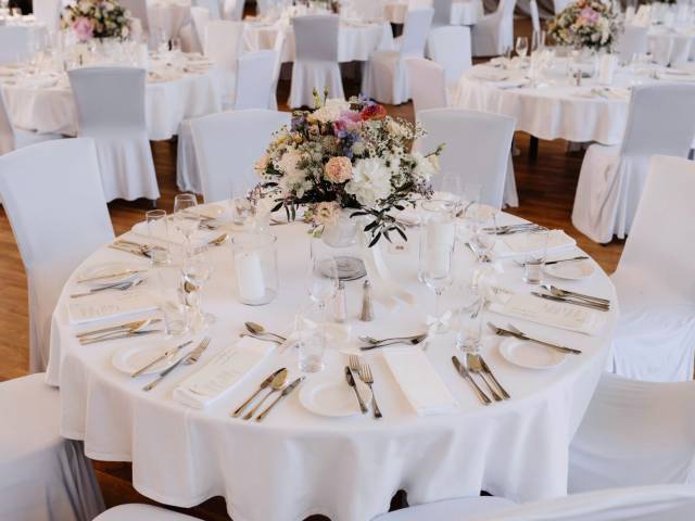 • Runde Tische und weiße Hussenstühle (optional)