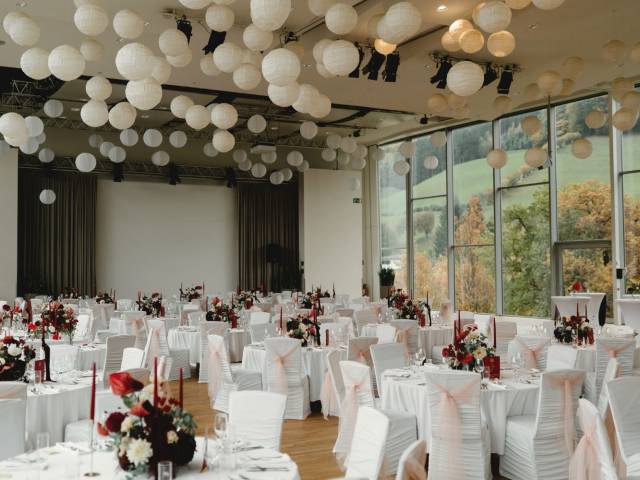 der perfekte Ort, um Ihre Hochzeit mit bis zu 300 Personen zu feiern und einen atemberaubenden Auslick zu genießen. Die Hochzeitslocation beeindruckt mit einer Raumhöhe von 7 Metern und einer besonderen Architektur, die ihn in ein lichtdurchflutetes Ambiente verwandelt. Mit einer Fläche von bis zu 600 m² bietet der Festsaal Platz für fröhliches Feiern mit ihren Liebsten.