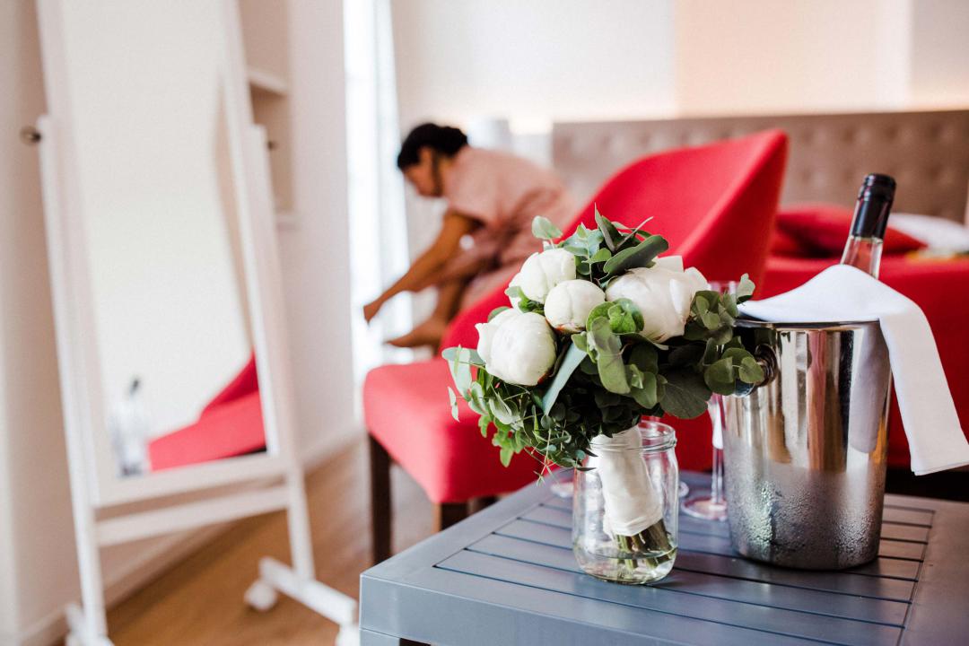 Die großzügige Suite bietet den perfekten Rahmen für die letzten ruhigen Momente vor der Trauung. Hier kann sich die Braut in aller Ruhe ankleiden, am Schminktisch stylen lassen und gemeinsam mit den Brautjungfern noch einmal anstoßen. Ein separates Ankleidezimmer sorgt für Privatsphäre und genügend Platz für Kleid, Styling und all die kleinen Details, die diesen Tag so besonders machen.