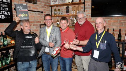 Titelfoto: v.l.n.r.: Eric Bordelet - Ciderpabst und Pomologe aus Frankreich, Moststraße-GF Christian Haberhauer, Mostbaron Hans "Hansbauer" Hiebl, Jürgen Schmücking - Journalist u. Fotograf, Claude Jolicoeur - Ciderguro aus Kanada: Mostropolis