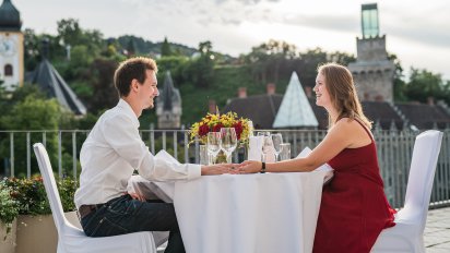 Mit Augenzwinkern hat Christiane uns mit dem Schlossteam etwas ganz Tolles auf dieser Privatterrasse vorbereitet: Unser privates Candle Light Dinner mit wunderschönem, großen Rundtisch, edlen, weißen Stühlen und romantischer Tischdekoration. Wobei der Hintergrund dem allen die Show stiehlt – leuchten doch die Dächer der Altstadt mit den Zinnen des Rothschildschlosses bei Start unseres Abendessens um 18:30 Uhr um die Wette.