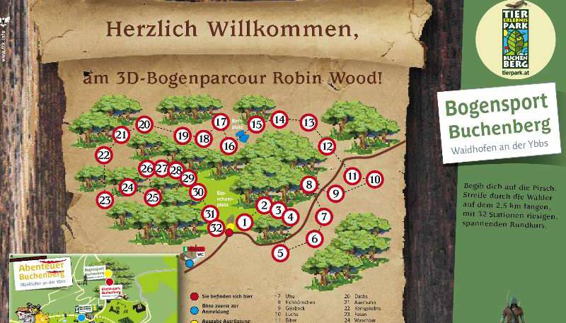 Der Bogenparcours am Buchenberg besticht wegen seiner 2,5 km lange Route durch den idyllischen Wald rund um den Tierpark, bei dem man an 28 Stationen heimische 3D Tiere entdecken und „erlegen“ kann.