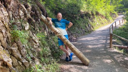 Wir starten allerdings flussaufwärts, direkt bei der Holztriftanlage, die gleich einmal einen imposanten Anblick bietet. Liebevoll aufbereitet mit zahlreichen Schaustücken lädt sie zum gemütlichen Verweilen ein. Mehrmals im Jahr kann man auch dem Schautriften beiwohnen. So, wie das Holz in der Hochblüte der Eisenstraße über Jahrhunderte zur Gewinnung von Holzkohle gewonnen wurde. Wir sind jedoch voller Tatendrang und beginnen direkt mit dem Holzweg, entlang des Mendlingbaches auf einer Länge von 2.400 Meter. In der Tiefe der Schlucht und durch die Kühle des Baches, sinkt hier die Temperatur auf verprochene 12 Grad. Mit dem Schatten der Bäume entsteht hier ein herrliches Mikroklima, ideal für ein wunderbares Erlebnis an so einem heißen Sommertag.
