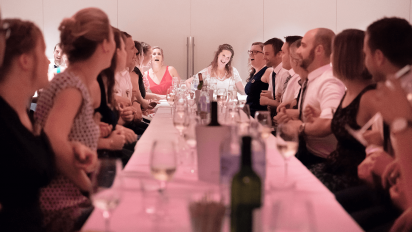 Nun geht es um das Einlösen der Braut. Ein üblicher Brauch ist, dass bei der U-Tafel der Bräutigam von einem Tafelende und der Zubräutigam (Trauzeuge) vom anderen Tafelende hinaufklettern, beim Glas jedes Mannes einmal trinken und jeder Frau ein Bussi geben müssen. Leider nicht ganz coronakonform, aber ein Riesenspaß!