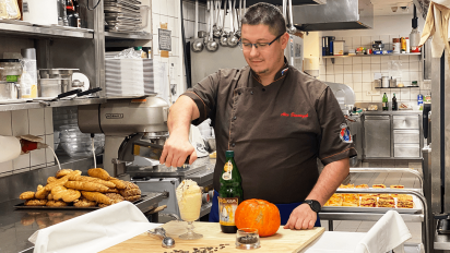 Küchenchef Alex verfeinert Vanilleeis mit Streißelberger-Kürbiskernöl.