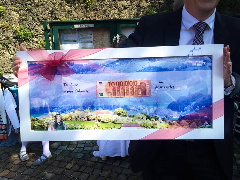 Dieses Geschenk eignet sich für nahezu jeden Anlass und überrascht allemal. Wir haben 1 Million als Geldgeschenk im Rahmen ganz im Stil des Mostviertels gestaltet und damit zur Hochzeit gratuliert.