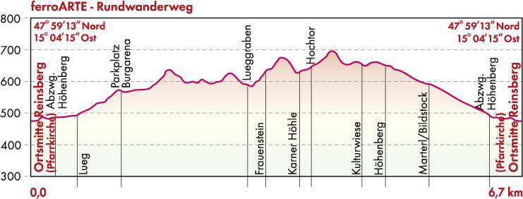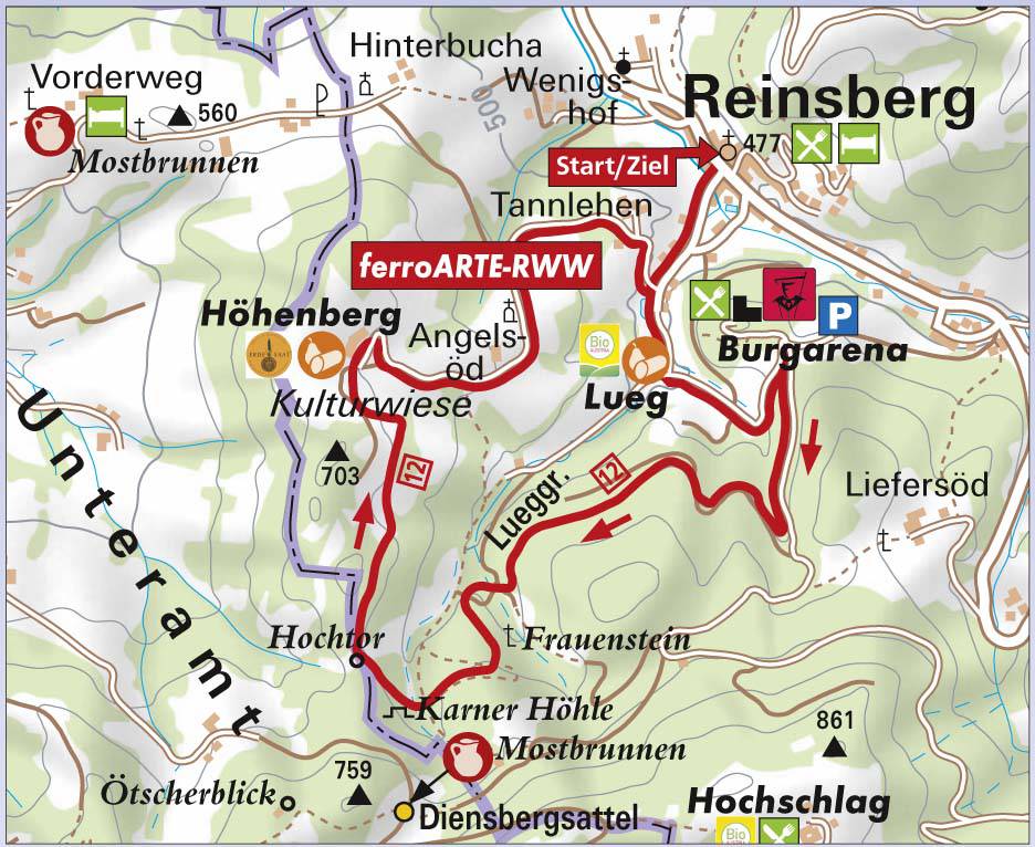 Vom Schloss an der Eisenstrasse fahren wir ca. 30 Minuten mit dem Auto durch dass Urltal und parken bei der Pfarrkirche in Reinsberg, denn hier startet auch der ferroARTE-Weg. Die Sonne hat mittlerweile die Umgebung schon mehr aufgeheizt als uns lieb ist, dennoch wandern wir neben duftenden Sommerblumenwiesen den Berg Richtung Burgarena hoch.