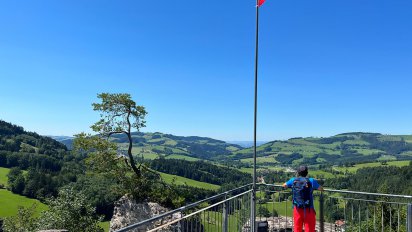 Unweit des Frauensteins finden wir das nächste Hinweisschild. hier könnte man sich noch die „Karner Höhle“ ansehen. Der Name stammt vom Desserteur Engelbert Karner, der sich im 1. Weltkrieg dem Militärdienst verweigerte und in einer Höhle versteckte. Er beschaffte sich heimlich Essen bei den Bauern und wurde auch des öfteren von der Militärstreife verfolgt, aber nie erwischt. Da es heute wirklich sehr heiß ist, beschließen wir die Abzweigung nicht zu nehmen und gehen den regulären Weg weiter. Wer weiß, ob wir die Höhle gefunden hätten, denn angeblich war sie auch Versteck von Schmugglern und auch Zufluchtsort im 2. Weltkrieg.