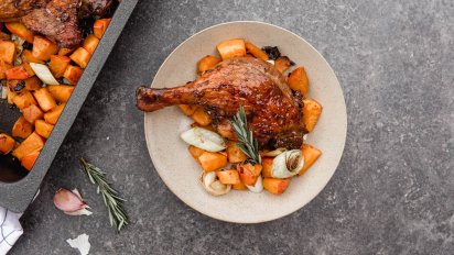 - Für eine extra knusprige Haut, die Keulen auf ein Backblech legen und mit Oberhitze oder unter dem Grill bräunen.