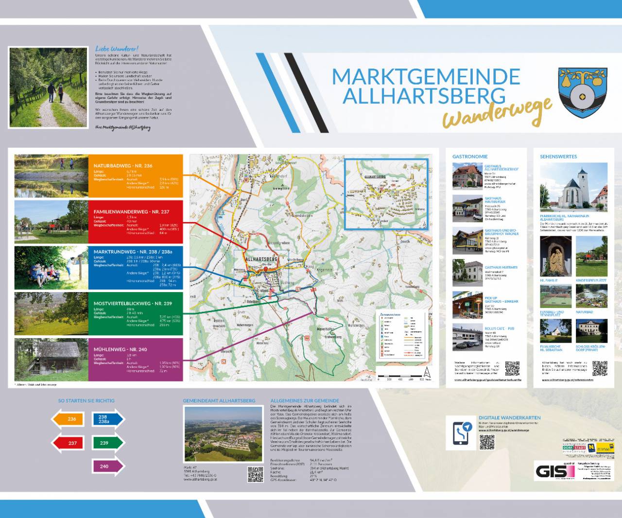 Das Auto parken wir in der Nähe der Kirche, denn dort ist auch das große Hinweisschild mit den drei offiziellen „Tut gut!“ Wanderwegen. Da das Wetter perfekt und wir motiviert sind, entscheiden wir uns für die längste und anspruchsvollste Route – den Mostviertelblickweg.
