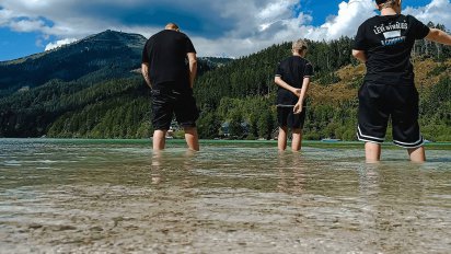 Im Nu sind wir wieder am Erlaufsee. Jetzt aber nichts wie ab ins kühle Nass. Kurz verschlägt es uns den Atem, als das Wasser unsere Haut berührt, denn es ist wirklich erfrischend kalt. Dann entscheiden wir uns doch lieber für das Stand-up-Paddle