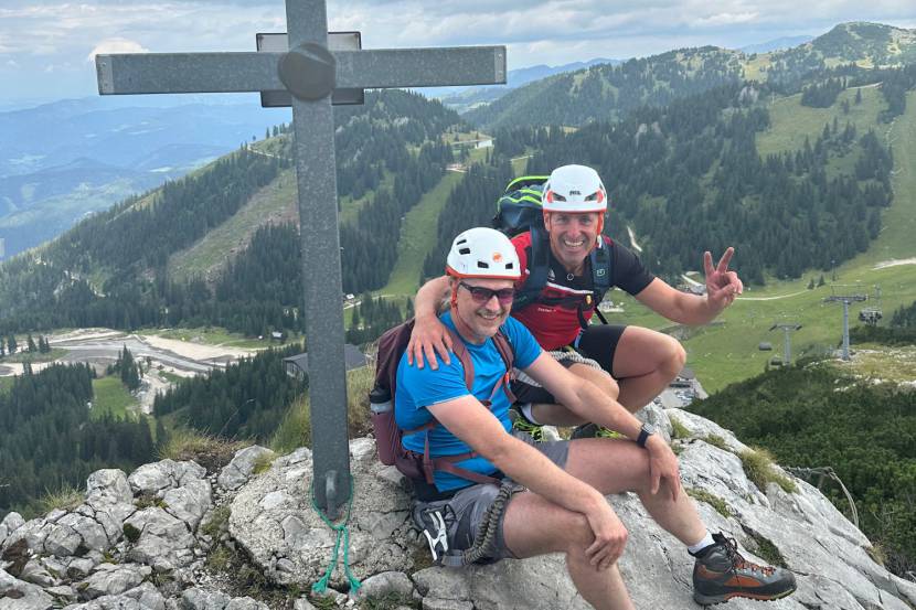 Nach gut zwei Stunden kommen wir bei der Leckerplanbahn heraus und gehen die letzten Meter auf der Skipiste zum Hochkarhof von Familie Kronsteiner, wo wir auf 1.450 Meter Seehöhe uns ein zweites Frühstück auf der Terrasse gönnen und damit einen ersten Ausblick auf das Hochkar und den oberen Hochkarboden geniessen. Mein Bruder und meine Nichte stossen dazu. Sie haben den Anstieg wie wohl die meisten mit dem Auto zurückgelegt und sind auch schon mit Klettersteigsets bewaffnet, ausgeliehen von der Liftstation. Zeit also für den ersten Klettersteig!