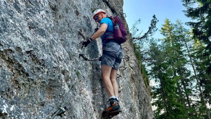 Stefan und ich wollen es allerdings wissen! Nach ausgiebiger Trinkpause nehmen wir die Leiter in Angriff, die in etwa 30 Metern sehr steil in die Wand führt. Als schwächerer von uns beiden gehe ich als erster. Ich muss mich voll auf die Aufgabe konzentrieren und versuche, nicht allzu oft nach unten zu blicken. Der Klettersteig hat den Schwierigkeitsgrad von C, was man gefühlt an jeder Stelle merkt. Er verlangt mir alles ab und zwingt mich, mit meinen Kräften hauszuhalten. Eine Stunde lang klettern wir auf einer Länge von 350 Metern in der Wand zuerst zickzack hinauf und anschließend quer über drei Seilbrücken.