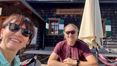 Von Ferne hören wir Blasmusik – die Landjugend feiert am „Modelsberg“ ihr Bergfest. So verlockend das klingt, unser Ziel bleibt der Prochenberg. Nach einem flotten Anstieg erreichen wir um etwa 16 Uhr die Prochenberghütte. Zwei erfrischende Durstlöscher füllen rasch unsere Energiespeicher auf. Danach kraxeln wir noch auf den Aussichtsturm: der 360°-Panoramablick ist spektakulär! Von hier reicht die Sicht vom Schneeberg bis zur tschechischen Grenze und sogar bis zum Dachstein. Ein Abstecher zum Gipfelkreuz am Kreuzkogel mit Eintrag ins Buch, rundet das Gipfelerlebnis ab. Für den Rückweg wählen wir den Weg Nr. 34/06 über Mitterlehen – ganz schön steil! Hier sind die Stöcke eine echte Hilfe. Vorbei an neugierigen Kälbern und einem Fischteich, erreichen wir wieder die Straße Richtung Prollingtal.