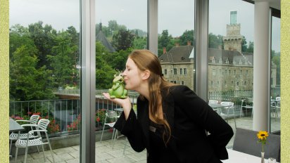 Auf ins nächste Zimmer. Davon gibt es hier ja reichlich. Wieder… ein heller, freundlicher Raum mit allem, was man zum gemütlichen Wohnen braucht. Jetzt kuschle ich mich mal in die Federn. Ist ja wirklich noch reichlich früh – kaum hell draußen bewundere ich die grüne Aussicht. Anschließend besuche ich das 250 m² große Fitnessstudio – schließlich sind Fitness und Mukis bei der Damenwelt sehr gefragt, wie ich aus leidvoller Erfahrung nun weiß. Hier kann man sich richtig auspowern. Top-Geräte – und, selbst hier, der atemberaubende Blick ins Grüne. Naja, atemraubend ist wohl auch mein Workout. Jetzt habe ich mir Wellness verdient. Da ist der Saunabereich mit Dampfbad, Tepidarium samt Indoor-Pool und Whirlecke genau das richtige für mich. Gut, dass um diese Zeit noch alle schlafen. Die Gäste wären wohl wenig begeistert, einen grünen Mitschwimmer unter sich zu haben. Andererseits kann ich so auch nicht auf die Liebe meines Lebens treffen. Also, weiter geht´s.Julia richtet im Schlossrestaurant das Mostviertler Frühstück her - aber sie nimmt keinerlei Notiz von mir