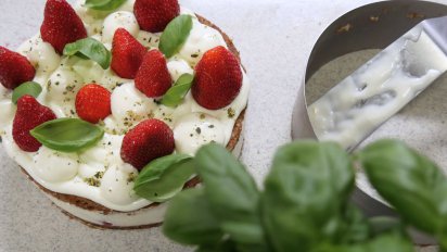 Für 3 Stunden kühl stellen und mit Erdbeeren und Basilikum verzieren.