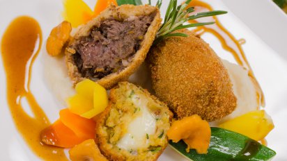 Gebackenes Rehragout mit Selleriepüree, Rotweinsauce und Mostviertler Falafel