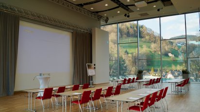 Einer der Seminarräume, der durch seine Aussicht auf Waidhofen besticht. Aqua (lat., aber auch italienisch, spanisch,...) heißt auf Deutsch Wasser. Logischerweise können Sie also in den Pausen ihres Seminars, Incentives oder Meetings den Blick aufs Wasser schweifen lassen und quasi mit der Ybbs meditieren. Aqua bezieht sich auf den Ausblick und nicht auf den Raum selbst – nur damit keine Missverständnisse aufkommen.Die Seminarräume in Niederösterreich glänzen mit der grandiosen Aussicht auf Waidhofen
