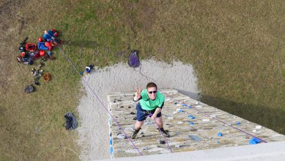 So, zuerst der gegenseitige Partnercheck: Theresas Sicherungsknoten sitzt, Gurte und Karabiner sind zu. Los geht’s. Jetzt das Seil auf Spannung bringen, spüren wieviel Seil Theresa beim Klettern braucht. Ich merke bald: Kommunikation ist hier alles. Teambuilding par excellence. Nach einem Sicherungsversuch bin ich dann mit dem Klettern dran. Die ersten Griffe sind kein Problem. Langsam weitersteigen. Nicht nur mit den Händen ziehen, sondern mit den Füßen klettern und „Nur ned hudeln“, denke ich mir. Nach einigen Metern spüre ich, wie die Arme müder werden. Kraft und Konzentration lassen merklich nach. „Runter bitte“, schrei ich zu Robert, der mich diesmal sichert. „Beine ausstrecken, vorsichtig ins Seil hängen und Aussicht genießen“, so die Instruktion des Profis. Ok, so leicht gibt’s wohl kein Aufgeben. Ich merke schon, Robert will mich heute zu Höchstleistungen treiben. Und so versuche ich – im Seil von der Warte hängend – so gut es geht seinem Rat zu folgen und einen Moment zu „entspannen“.Alles Kopfsache