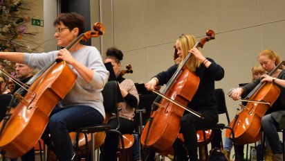 Cellisten des Waidhofner Kammerorchesters bei der Generalprobe für das Neujahrskonzert im Schloss-Center beim Seminarhotel Schloss Eisenstrasse.
