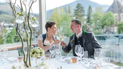 Coverfoto mit Ausblick auf Saal und Rothschildschloss, Pärchen beim Anstoßen, Kerzen: Pamela Berger